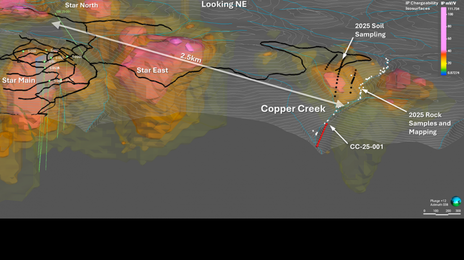 Star Main drilling in Phase 2 centered around the relationship between supergene to hypogene transition and the structures that carry the mineralization. Copper Creek is a historically drilled target 2.2 km Southeast of the Star Main deposit and has a very strong soil signature associated with a coincident chargeability high similar to Star Main. One hole was drilled to a depth of 120 m and intersected strong VMS mineralization over a broad intercept at the target depth. Star North, which is another strong soil anomaly and coincidental chargeability high, located 1 km northeast of the Star Main saw 400m of drilling to test the structure to allow for further drilling to expand the target in 2026. Star Main also saw additional follow up drilling during phase 2 to confirm the hypogene mineralization and expand the overall deposit model. A total of 13 holes were drilled at Star Main with 11 assays still pending.