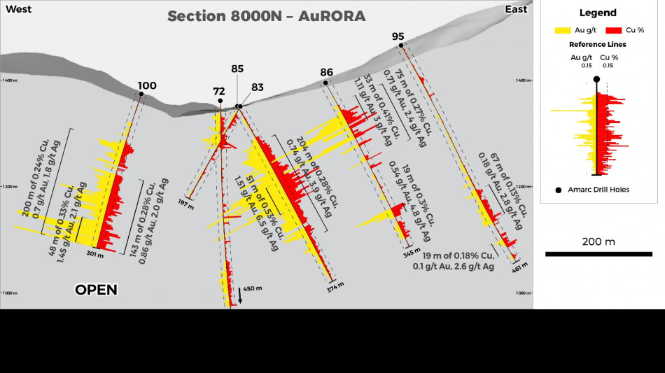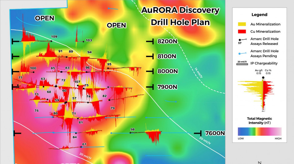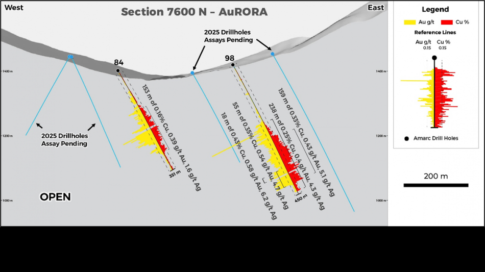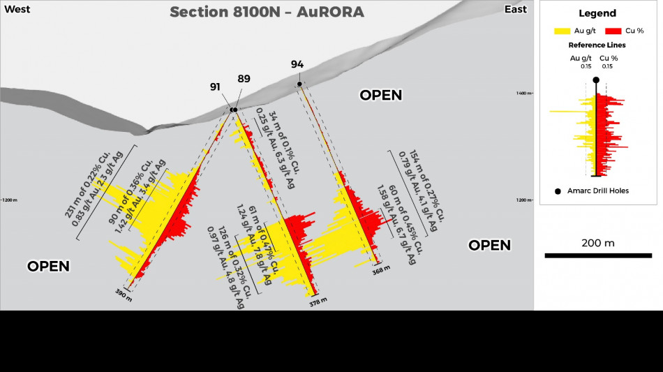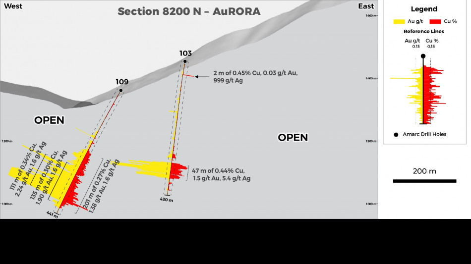 Results announced in November from six holes completed on Sections 8000N and 8100N successfully expanded AuRORA +200 m to the north (see Amarc release October 22, 2025). Today, we are announcing two drill holes (JP25103, JP25109) located on Section 8200N, which have expanded AuRORA a further +100 m to the north (Figures 1, 2, 3 and 4, and Tables 1 and 2).