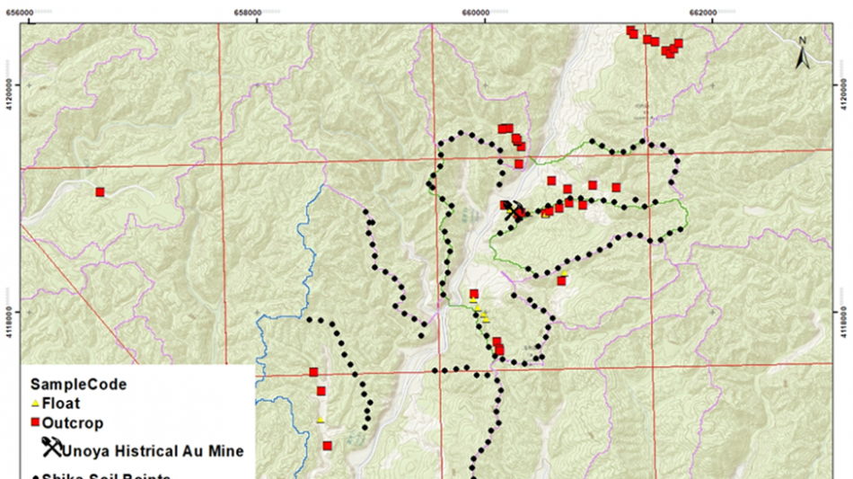 Host rocks in this area are comprised mostly of basaltic andesite, andesite and minor interlayered siltstone, sandstone and conglomerate. The best individual soil sample was obtained in the western Mii area with a high concentration of gold of 54.7 ppb. Other elements in this sample are notably elevated including Ag (0.1 ppm), Hg (16.8 ppm), Sb (42.6 ppm) and As (1935 ppm). These results indicate future follow up field work is highly warranted in the Mii area.