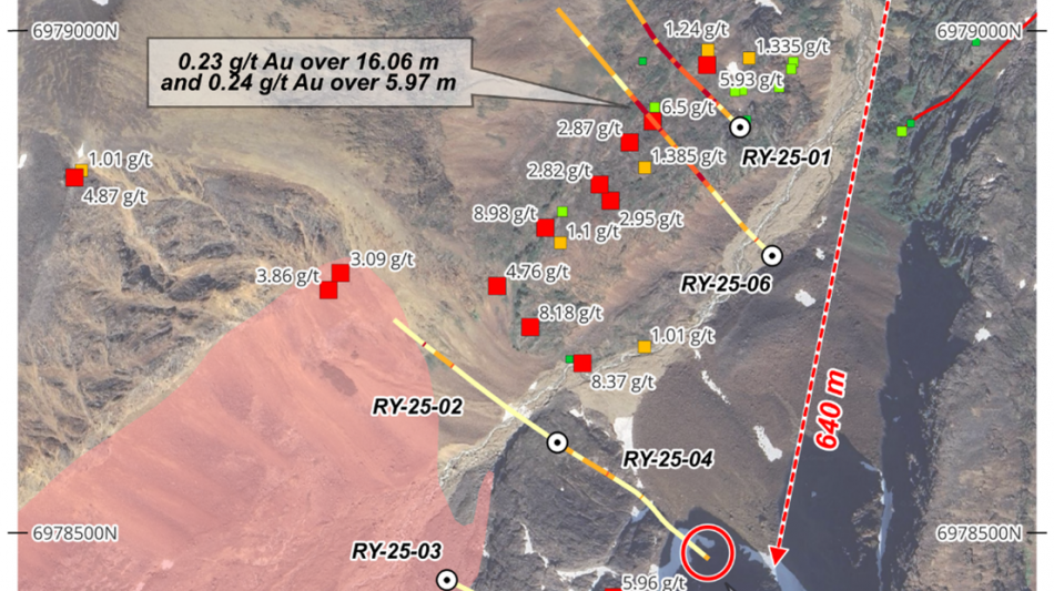 The final hole of the program, RY-25-06, was collared about 130 metres behind, and south of RY-25-01 which intersected 1.98 g/t gold over 15 metres within a broader intercept of 1.02 g/t gold over 37 metres as reported previously. RY-25-06 intersected a 210 m wide zone of sheeted veining, with vein densities similar to those measured in the first hole. An analysis of geochemical ratios indicates RY-25-06 sampled a lower-temperature portion of the hydrothermal system. Significant results from the 2025 drilling are tabulated below.