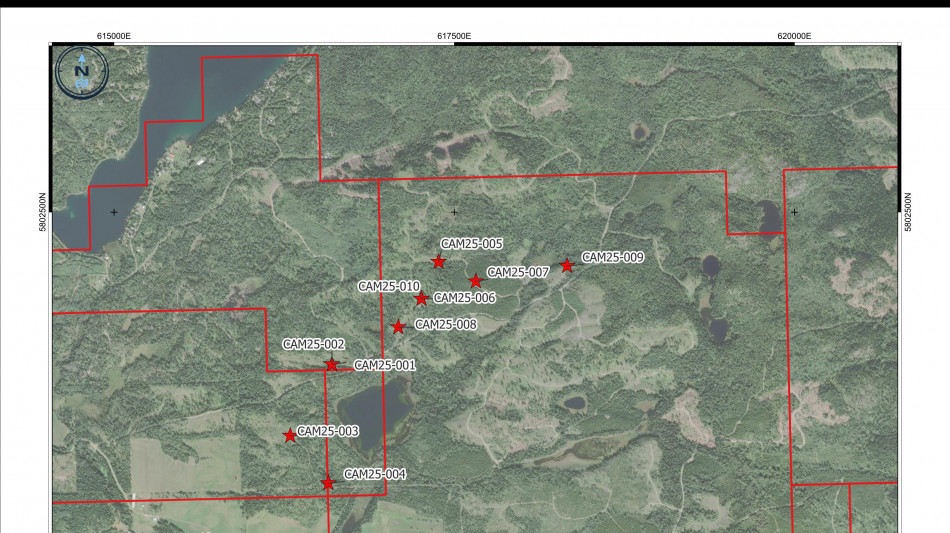 To test as many targets as possible, eight of ten holes were stopped at about 200 m despite the presence of pyrite and chalcopyrite at the bottom of most holes. Hole CAM25-004 was stopped at 102 m and CAM25-10 (which tested a deeper geophysical target) was extended to 301 m. Drill core samples from holes CAM25-007 and CAM25-009 have been sent for "rush" assay.