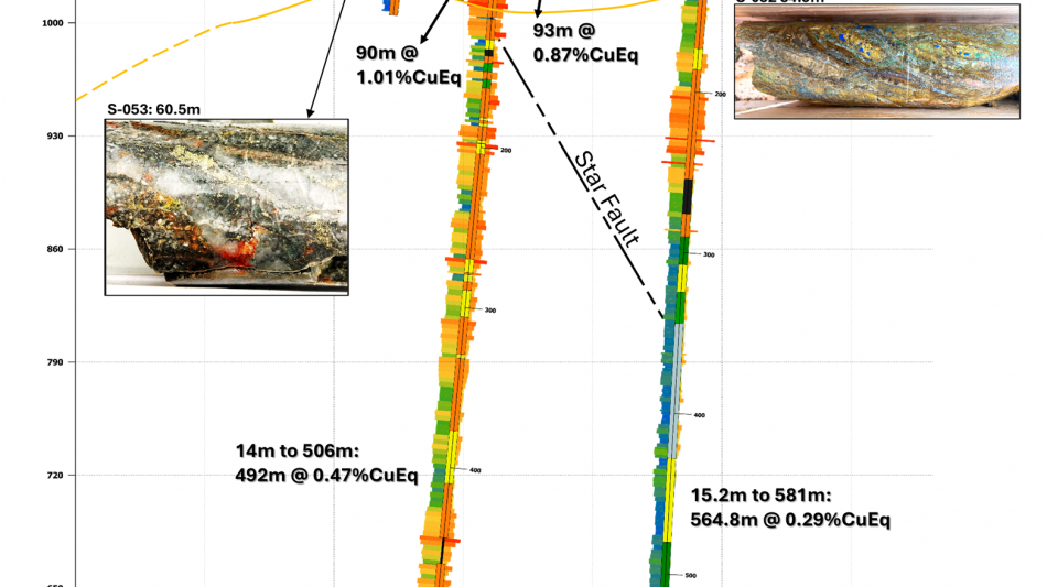 Hole S-053 intersected 81m 0.6% CuEq (0.48% Cu & 0.13 g/t Au) from 12m.