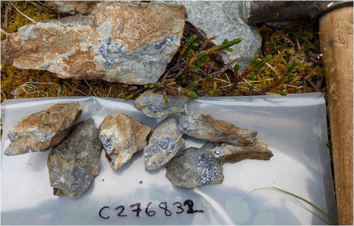 Figure 6: Galena mineralization in dolomite at Bob Showing, yielding up to 17.8% Pb and 1.9% Zn.