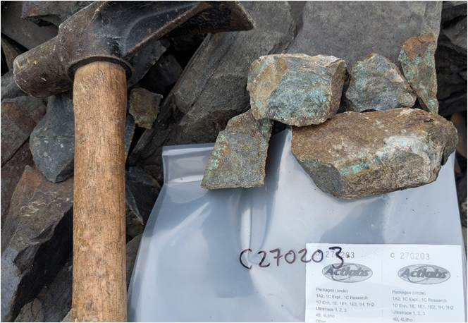Figure 3: Disseminated chalcopyrite-bornite at the Expert Showing, yielding up to 5.42% Cu and 1.89 g/t Au. Chalcopyrite is the yellow metallic mineral, with bornite (purple-blue), with surficial recent weathering to green malachite.