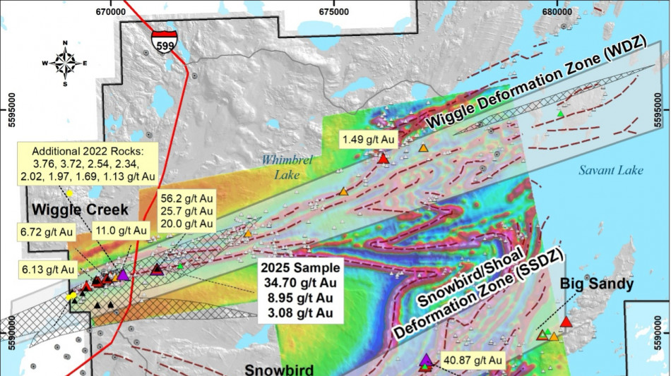 A total of 68 grab samples were collected during the October 2025 field work, for which all assays have now been received. The highlights below are from the Wiggle Creek area of the project. All coordinates are in UTM NAD83, Zone 15 North.