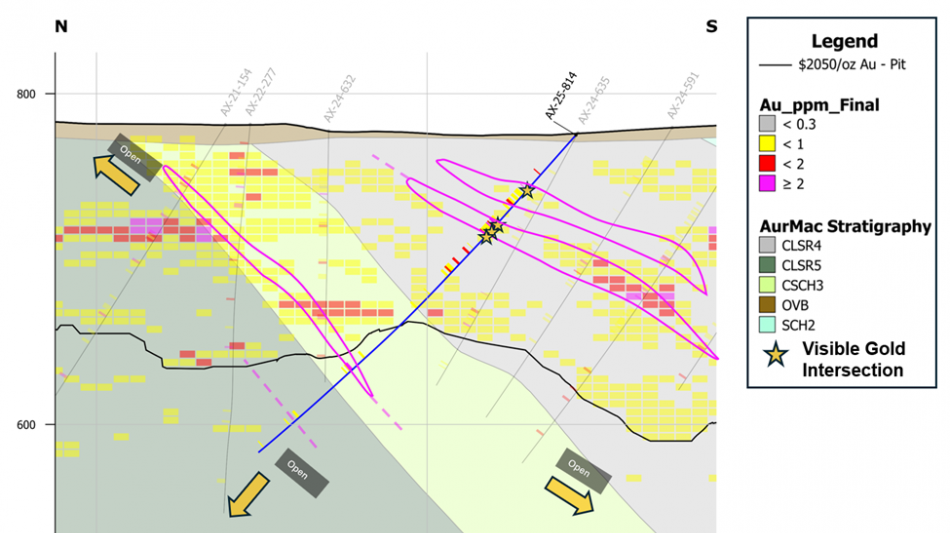 Figure 3: Cross-section A-B in Central Powerline (See Figure 1). High-grade mineralization in AX-25-819 and -821 has the potential to extend mineralized domains below the conceptual pit boundary from the 2025 Mineral Resource Estimate ("MRE"). Magenta outlines show preliminary potential mineralized zones. Once refined, these domains will aid in better constraining estimations of the distribution of gold in the MRE.