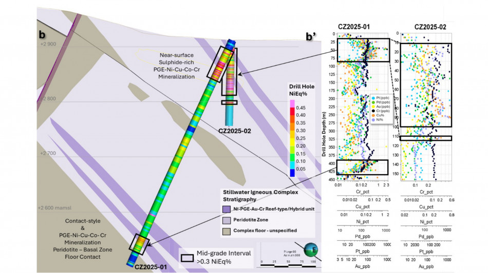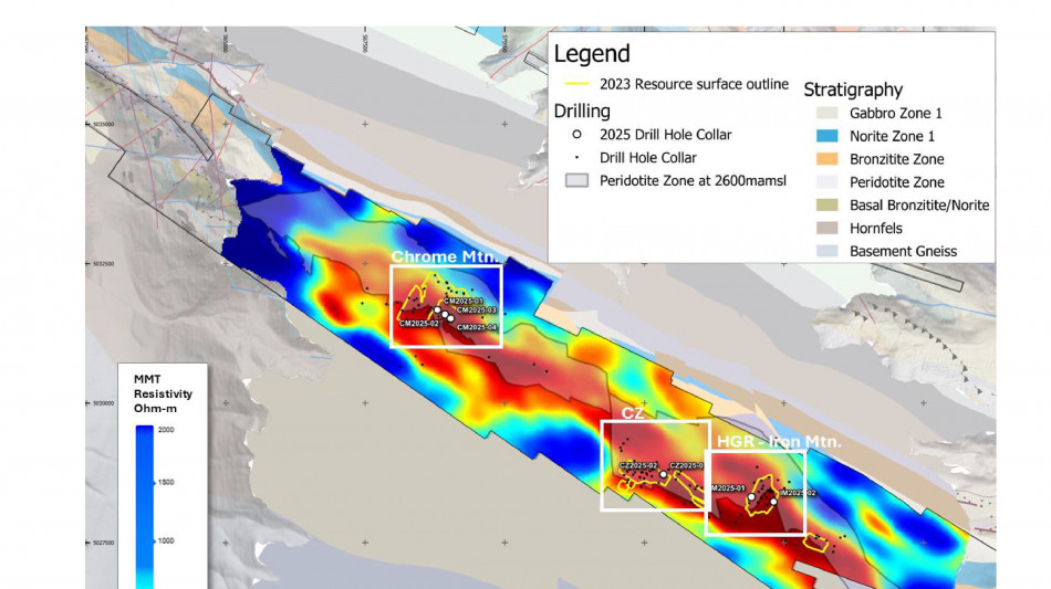 Dr. Danie Grobler, Vice-President Exploration, commented "Our 2025 work defined two near-surface, highly prospective areas at Chrome Mountain and Iron Mountain. All eight holes intersected magmatic sulphide mineralization, confirming that the large geophysical anomalies map sulphide-rich stratigraphy beyond current resource boundaries. At Iron Mountain, the CZ deposit conductive trend appears to connect toward the Central-HGR resource areas, while at Chrome Mountain a large anomaly extends to the southeast-together indicating potential continuity over a 10-kilometer strike length of mineralized magmatic stratigraphy. These results validate our model and materially expand the set of drill-ready targets for resource growth. Furthermore, our current geological interpretation including results from CZ2025-01 indicates probable thrust-fault duplication of the lower Peridotite zone with its mineralized zones in the CZ deposit area, as shown in Figures 8 and 9."