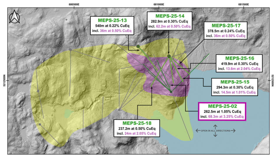 Jeremy Niemi, SVP Exploration and Development, commented, "We are very excited about these wide intervals of copper from surface and, importantly, the systematic expansion of the high-grade bornite zone by 150 metres around the discovery hole MEPS-25-02. Each step-out hole has successfully extended the zone either laterally or vertically, demonstrating strong continuity of the high-grade core within a much broader copper system. The mineralization remains open in most directions, and we are beginning to see clear structural and grade trends emerging that will guide our 2026 resource-focused drilling."