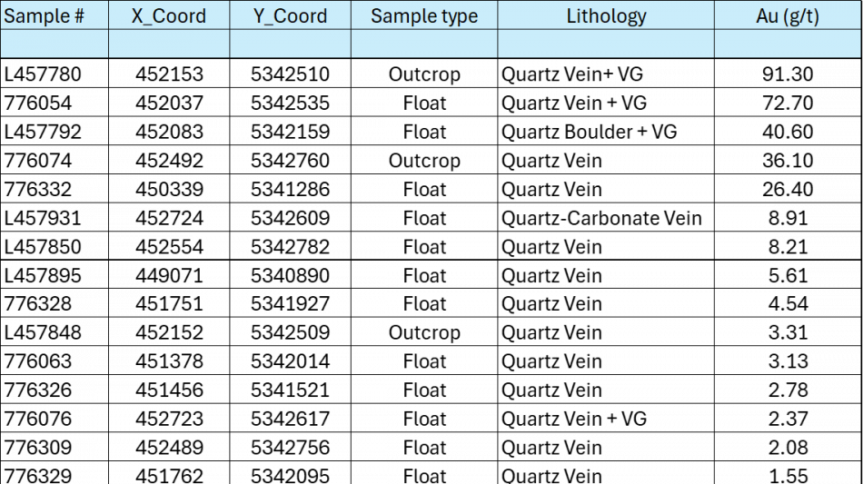 The reported rock samples are selective grab samples (from outcrop and/or float) and are not necessarily representative of mineralization on the property. The presence of visible gold in certain samples is qualitative in nature and does not indicate the grade distribution of mineralization. A total of 292 rock samples were collected during the entire traversing program across all areas. Table 1 lists the 16 samples collected within the newly identified mineralised trend that returned > 1g/t Au.