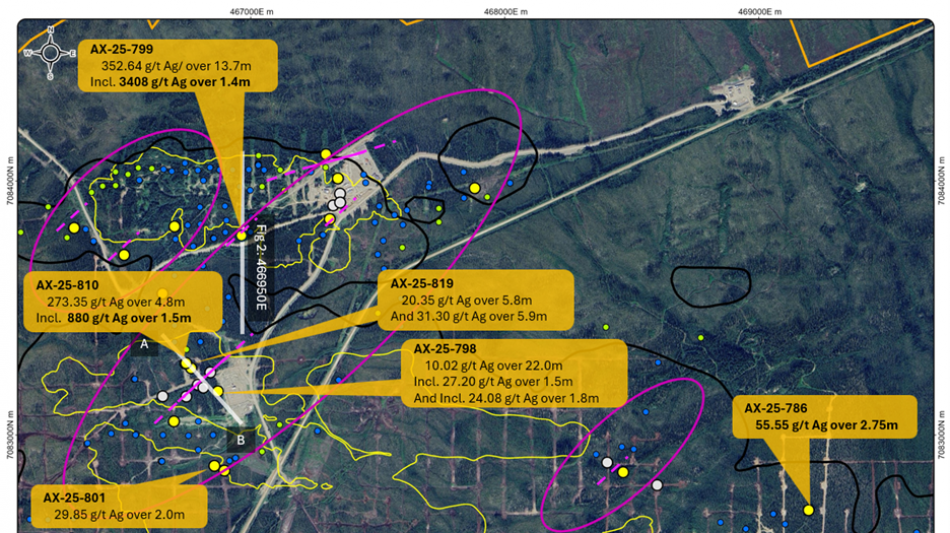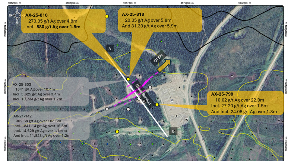 AX-25-810 - 880 g/t silver over 1.5m, within 273.35 g/t Ag over 4.8m, AND 248 g/t silver over 1.0m within 114.52 g/t Ag over 4.1m