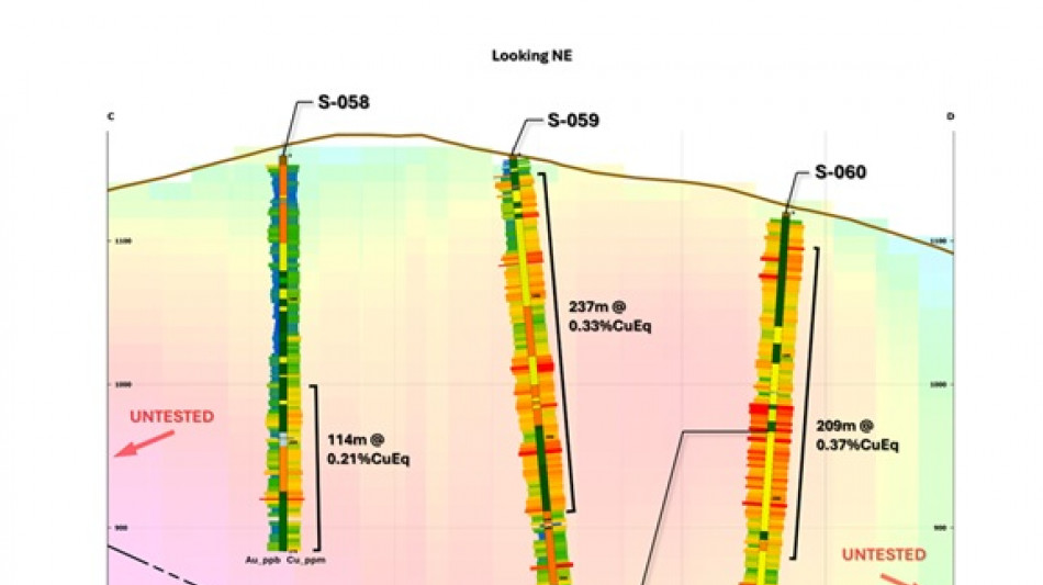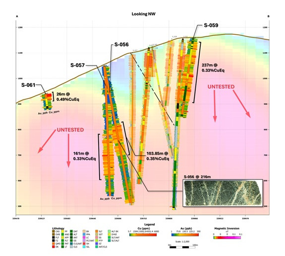 Hole S-059 intersected 313m of 0.281% CuEq (0.217% Cu and 0.063 g/t Au) from 3.35m