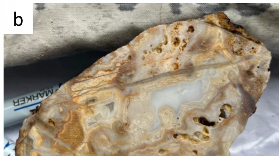 b: Sample NT-0485 (Au 9.33gpt, Ag 12.6gpt): massive to brecciated quartz vein float with crustiform banding, Open spaced cavities at places