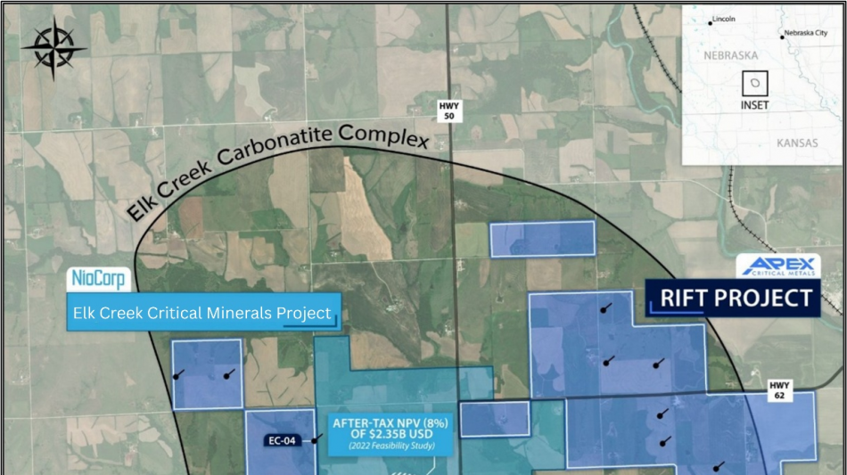 Apex Critical Metals Corp. is a Canadian exploration company focused on advancing rare earth element (REE) and niobium projects that support the growing demand for critical and strategic metals across the United States and Canada. The Company's flagship Rift Project, located within the highly prospective Elk Creek Carbonatite Complex in Nebraska, U.S.A., hosts extensive rare earth rights surrounding one of North America's most advanced niobium-REE deposits. Historical drilling across the complex has reported broad intervals of high-grade REE mineralization, including intercepts such as 155.5 m of 2.70% REO and 68.2 m of 3.32% REO.