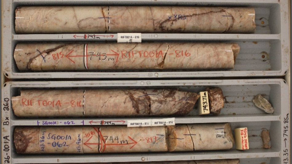 Figure 3. Drill core from RIFT26-001A (740.7 to 745.85 m) and RIFT26-003 (833.55 to 839.09 m) showing intersected carbonatite intervals