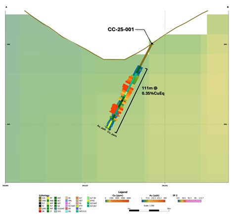 CC-25-001 intersected 111.00m of 0.348% CuEq (0.178% Cu and 0.167 g/t Au) from 40.00m.