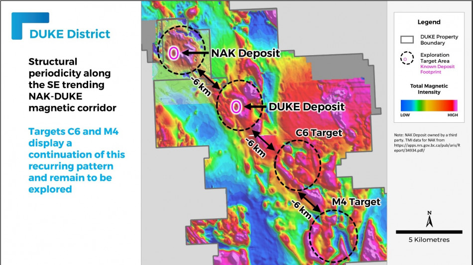 Notably, the large DUKE Cu-Mo-Au-Ag Deposit lies approximately 6 km to the southeast of American Eagle's promising NAK Cu-Au Deposit (see American Eagle website https://americaneaglegold.ca). Figure 1 illustrates a structural periodicity along the southeast trending regional NAK-DUKE magnetic corridor. The NAK and DUKE Deposits, outlined in red, are situated within evenly-spaced, recurring clusters of magnetic anomalies. The DUKE JV's targets C6 and M4 display a continuation of this recurring pattern to the southeast of the DUKE Deposit, showing magnetic anomalies clustering at repeated 6 km spacings. These exploration targets are interpreted to reflect zones of fault intersections with regional southeast trending structures, representing mineralizing fluid pathways analogous to those responsible for most deposits in the Babine Region. Future exploration by the DUKE JV will focus on identifying prospective chargeability and geochemical anomalies across these target regions to firm-up drill targets.