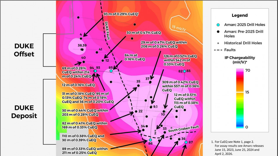 Additionally in 2025, three holes were drilled along a 440 m long east-west fence across the southern end of DUKE Offset (120 m to 150 m south of previous drilling, Figure 2 and Table 1), extending this deposit-area. Previous drilling by Amarc within the DUKE Offset encountered important Cu-Mo mineralization outlining a newly recognized volume of mineralized rock west of the DUKE Fault. This represents a portion of the DUKE Deposit of unknown extent that was displaced some 450 to 500 m northwards (see Amarc release June 25, 2024). Hole DK25085 returned 84 m at 0.16% CuEQ (0.10% Cu, 0.01% Mo, 0.02 g/t Au, 1.0 g/t Ag) from 105 m, hole DK25094 returned 12 m of 0.16% CuEQ (0.09% Cu, 0.02% Mo, 0.01 g/t Au, 0.5 g/t Ag) from 54 m, and hole DK25093 returned 31 m of 0.18% CuEQ (0.13% Cu, 0.01% Mo, 0.02 g/t Au, 0.6 g/t Ag) from 31 m, 95 m of 0.13% CuEQ (0.10% Cu, 0.02 g/t Au, 0.5 g/t Ag) from 101 m, 74 m of 0.18% CuEQ (0.11 Cu, 0.01% Mo, 0.09 g/t Au, 0.9 g/t Ag) from 219 m and 36 m of 0.20% CuEQ (0.15% Cu, 0.05 g/t Au, 1.4 g/t Ag) from 314 m. The DUKE Offset area now extends over greater than 400 m north-south, 450 m east-west and 250 m in depth.