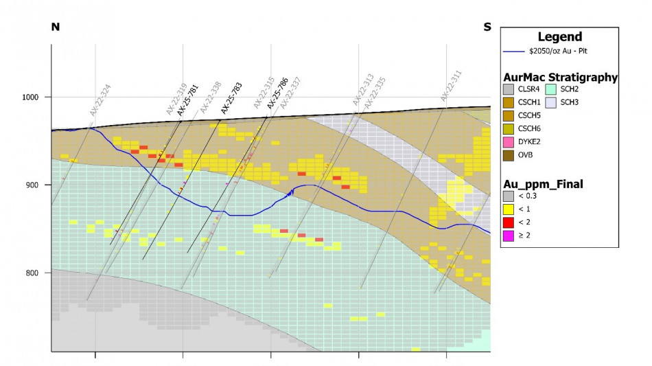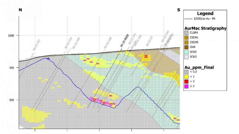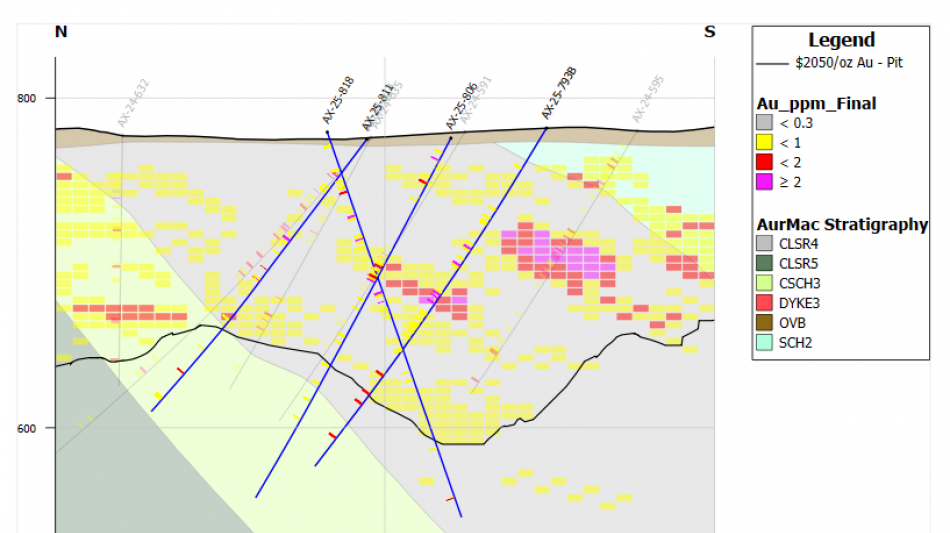 Figure 5: High-grade mineralization near surface in drillhole AX-25-800B has potential to convert additional waste blocks in the Eastern Powerline (Aurex Hill) satellite pit.
