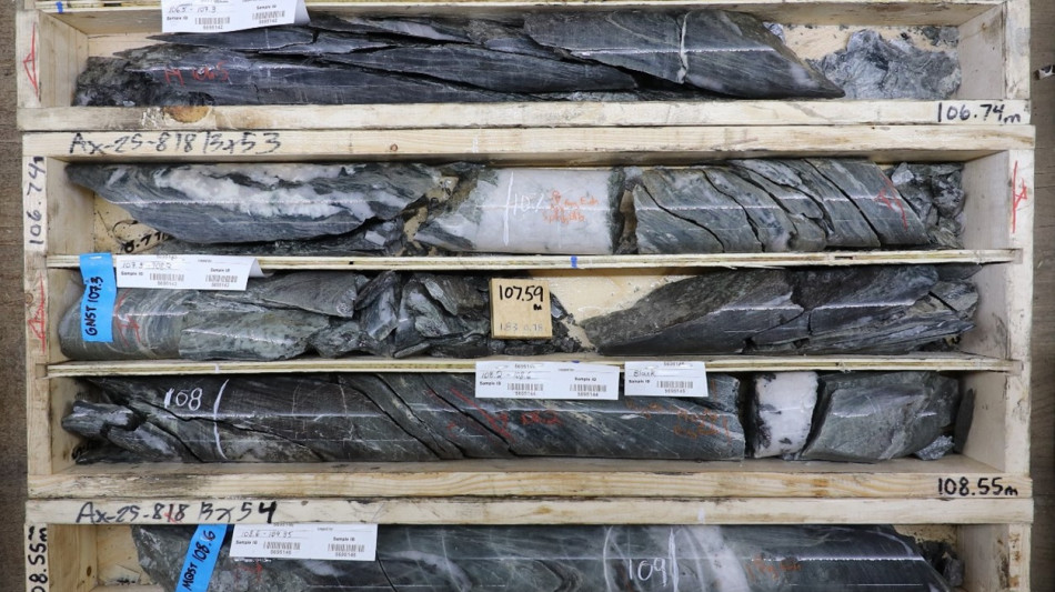 Figure 3: Diamond drill core from AX-25-818. Sheeted veins cutting metasedimentary rocks of the Hyland group, typical of the Powerline deposit hosting trace Bismuth sulphosalts, arsenopyrite and visible gold (See Figure 2).