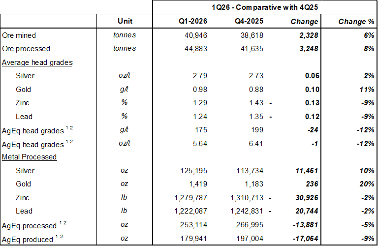 2 AgEq ounces produced were calculated based on all metals produced using the average sales prices of each metal for each month during the period. Revenues from concentrate sales do not consider metallurgical recoveries in the calculations as the metal recoveries are built into the sales amounts. In Q1 2026, AgEq was calculated using metal prices of US$82.94 per oz Ag, US$3,227.32 per oz Au, US$0.87 per lb of Pb and US$1.46per lb of Zn.