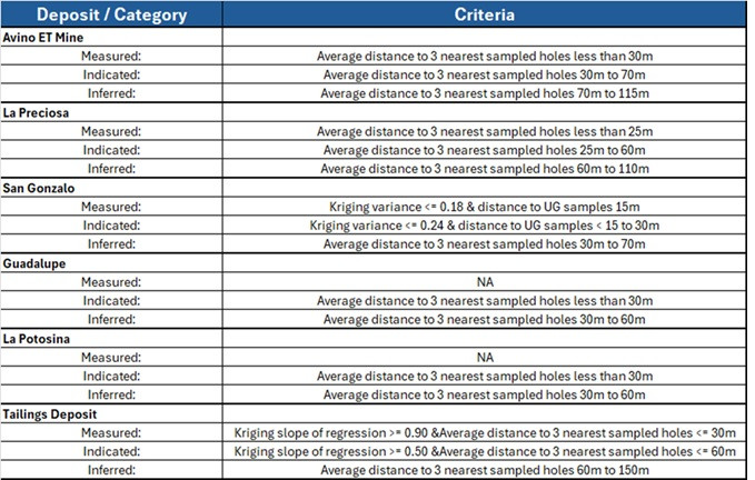 Mineral resources were estimated by ordinary kriging, optimized using kriging neighbourhood analysis and verified by means of nearest neighbour and inverse distance methods, swathplot comparisons of estimates and visual inspections. Block models were created for the San Gonzalo, and Avino Vein Systems ET, Guadalupe, La Potosina, La Preciosa and the Oxide Tailings deposit, and estimates were made using industry standard techniques.