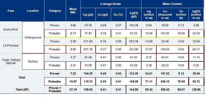 Inaugural Proven and Probable Mineral Reserves at La Preciosa and Avino: The proven and probable mineral reserves at the Company's three assets totaled 27 million tonnes containing 95 million ounces of silver at a grade of 109 g/t, 356 thousand ounces of gold at a grade of 0.41 g/t, and 85 million pounds of copper at a grade of 0.31%. This calculates to 127 million silver equivalent ounces at a grade of 145 g/t.