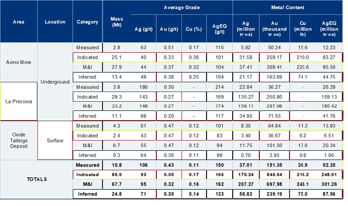 Based on recent mining costs, Mineral Resources are reported at La Preciosa Ag recovery 80%, Au Recovery 70%, Ag price $36.90/t. oz., Au price $3,210/t. oz. Cut-off grades in silver equivalent grades (AgEQ), Avino Mine - 55 g/t, La Preciosa Underground - 120 g/t, Oxide Tailings -50 g/t.