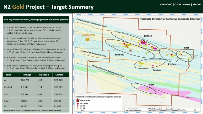 Formation Metals Inc. is a North American mineral acquisition and exploration company focused on the development of quality properties that are drill-ready with high-upside and expansion potential. Formation's flagship asset is the N2 Gold Project, an advanced gold project with a global historic resource of ~871,000 ounces (18 Mt grading 1.4 g/t Au (~810,000 oz Au) across four zones (A, East, RJ-East, and Central)2,3 and 243 Kt grading 7.82 g/t Au (~61,000 oz Au) across the RJ zone2,4) and six mineralized zones, each open for expansion along strike and at depth including the "A" zone, of which only ~35% of strike has been drilled (>3.1 km open), and the "RJ" zone, host to historical high-grade intercepts as high as 51 g/t Au over 0.8 metres.