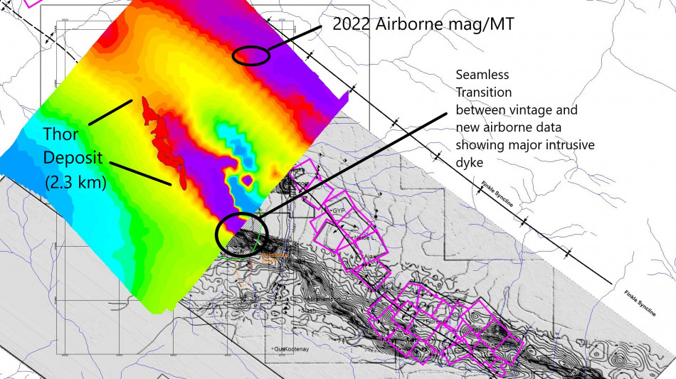 Taranis' land package now exceeds 6,000 contiguous hectares, encompassing numerous historic silver mines that saw limited exploration over the past 130 years. Taranis' integrated approach is providing new clarity on the structural, stratigraphic and intrusive controls that link the historic mines to the Thor deposit. A particularly noteworthy success is the integration of a 1989 airborne magnetic survey (commissioned by Nortran and Multiplex Resources) with Taranis' own airborne magnetotelluric survey conducted in 2022. Taranis has been able to join both surveys for a combined length of 14 km covering Taranis entire land package.