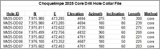 Choquelimpie drill samples have been analyzed for silver, copper, lead and zinc using the Inductively Coupled Plasma (ICP) analytical method. Initial assay values for some samples were reported as "over-limit," meaning the ICP method is not accurate above a stated maximum concentration. These samples have been re-assayed by atomic absorption spectrometry (AA), a method which is accurate at the higher concentration levels. The AA results have been received for much of the Phase 3 (2025) drilling, with distinct zones of silver-lead-zinc, lead-zinc and copper mineralization being intersected. Continuous base-metal intercepts, along with the corresponding gold and silver concentrations, are summarized in Table 1. The primary gold intercepts, previously reported in a Norsemont press release dated 24 February 2026, are also included. Gold-equivalent (AuEq) values are now also reported (Table 1).