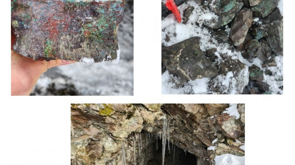 While attempting to access historic trenches (obscured by snow), the field crew observed large boulders with visible malachite on slopes below the historic Main Zone. Two grab samples were collected. These boulders are interpreted as talus likely derived from the Main Zone mineralization upslope, providing additional confirmation of copper mineralization in the area.