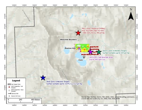 Table 2-Sample spacing: 25 m on all lines. Samples collected from B-horizon soils. Star Copper 2025.