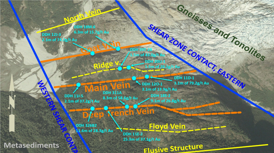 Deep Trench Vein: 15.3m grading 37.1 g/t Au, 8.3m grading 58.6 g/t Au, 11.6m grading 28.3 g/t Au |